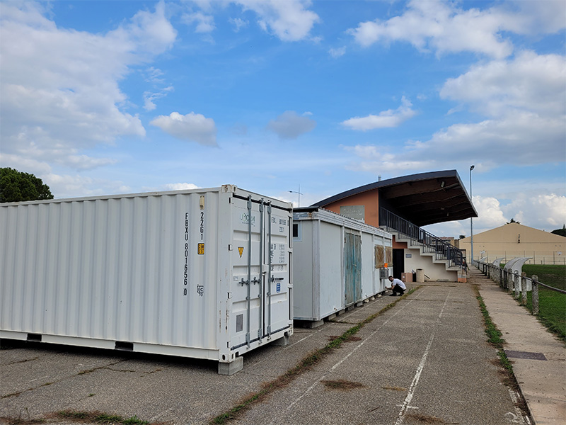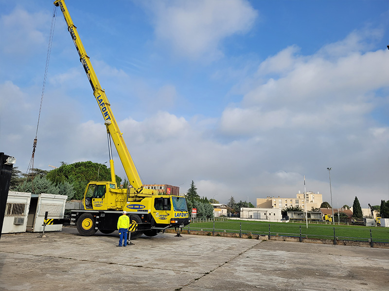 PRESTATION : Prestations de serviceLIEU : Bagnols sur Cèze (30)DÉLAIS : 3 joursSURFACE : 75 m²RÉALISATION : Transfert de bâtiment et aménagements internes avec électricité.